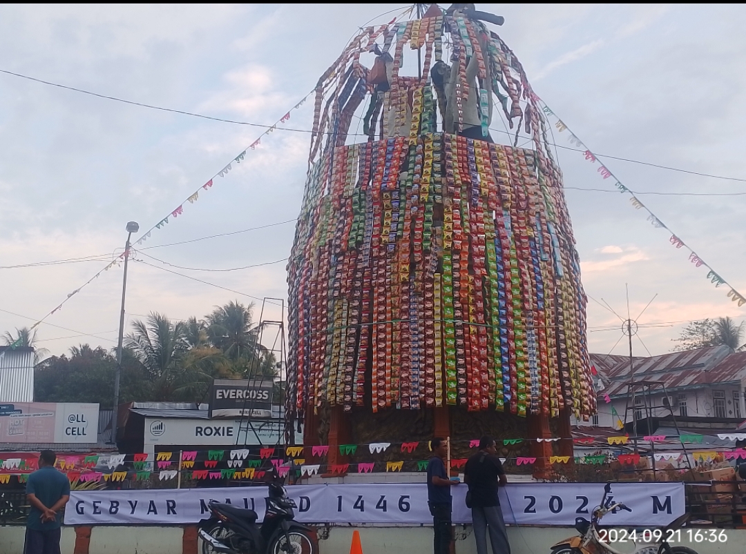 bitungnews.id || Gorontalo, Pelaksanaan peringatan Maulid Nabi Muhammad SAW bertempat diBundaran Patung Tani Daerah Khusus Isimu (DKI) Kecamatan Tibawa Kabupaten Gorontalo, tahun ini berlangsung meriah dengan sentuhan unik. Tugu Tani di persimpangan sentral Isimu yang biasanya berdiri megah setinggi 7 meter, disulap menjadi tolangga raksasa. Tolangga tersebut dihiasi dengan aneka snack senilai total Rp 15 juta, menarik perhatian ratusan warga yang hadir. Ahad (22/09/2024).