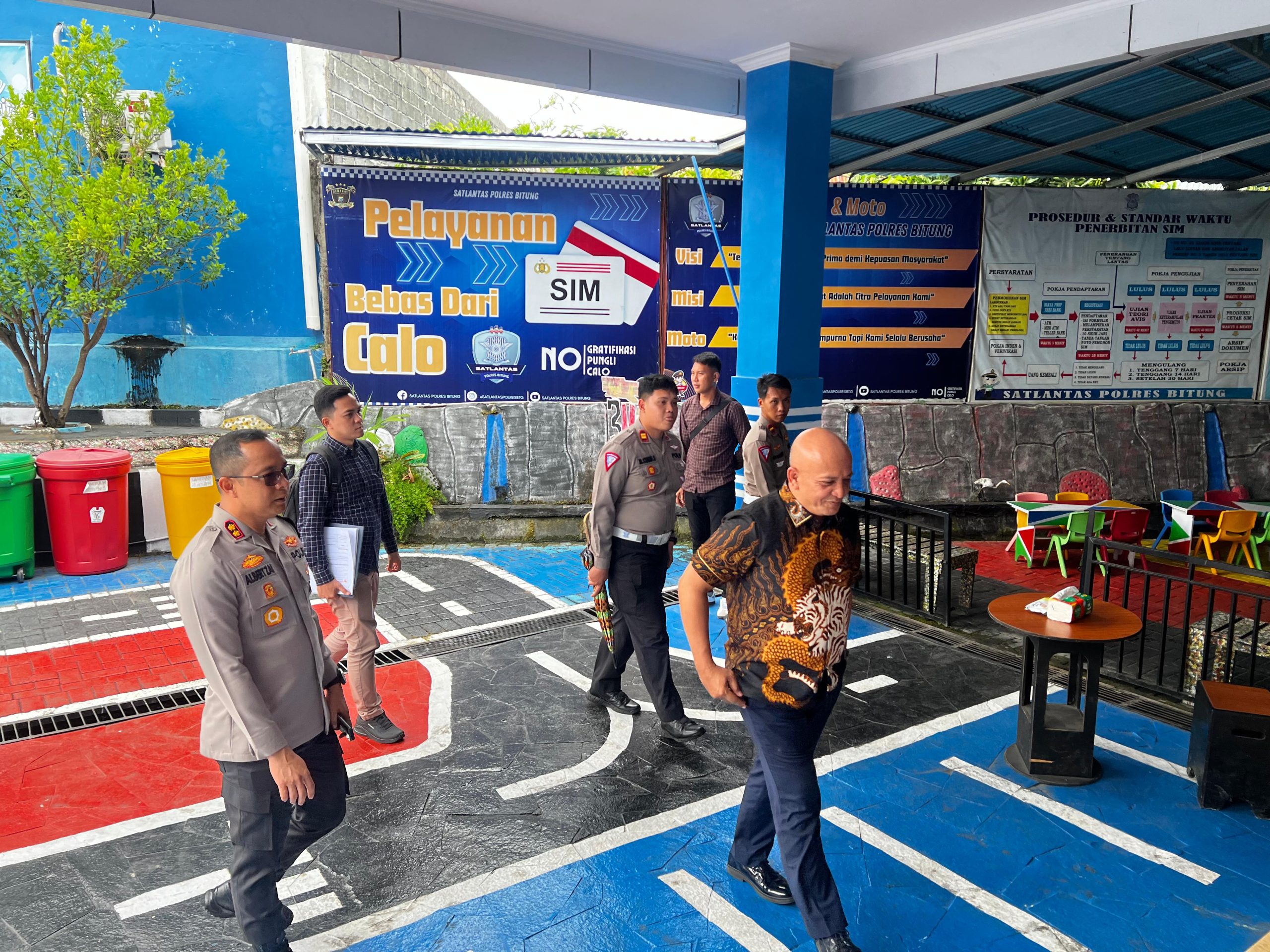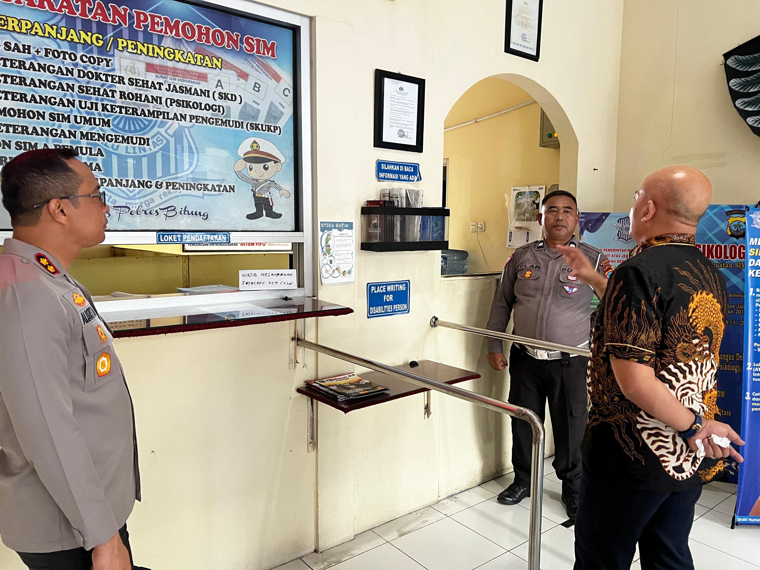 Dalam peninjauan terhadap pelayanan masyarakat baik di SPKT maupun di Satuan Lalulintas Polres Bitung, Tim juga memberikan beberapa masukan untuk pemenuhan kelengkapan prasarana yang ada diruangan pelayanan masyarakat.