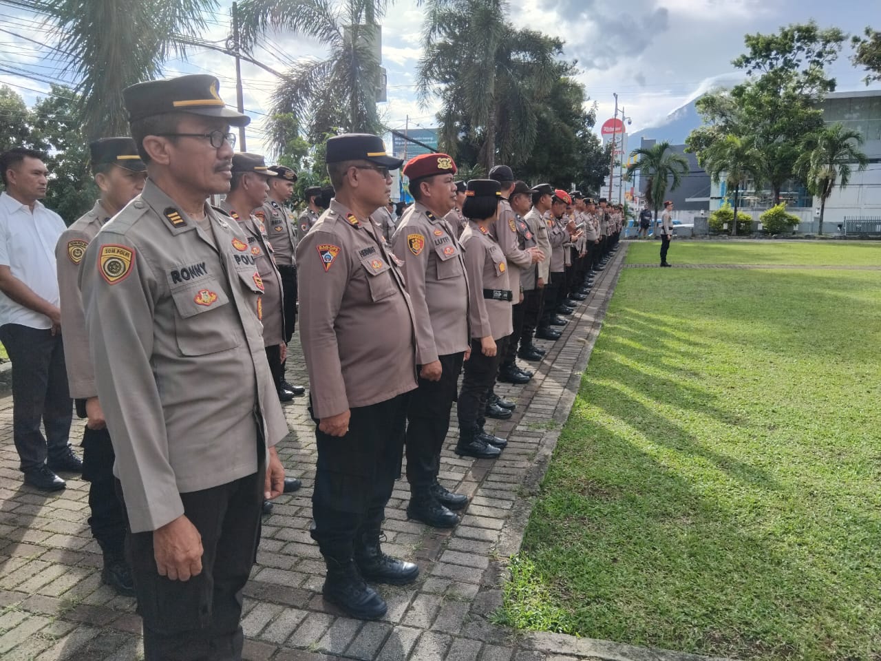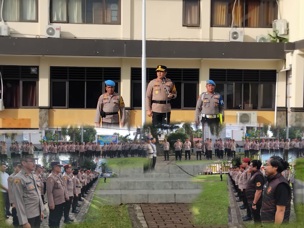 Apel dipimpin Kapolres Bitung *_AKBP Albert Zai, S.I.K, MH_*, dengan diikuti oleh para PJU Polres Bitung, Kapolsek jajaran Polres Bitung dan seluruh anggota yang terlibat dalam Pengamanan di Gereja-Gereja.