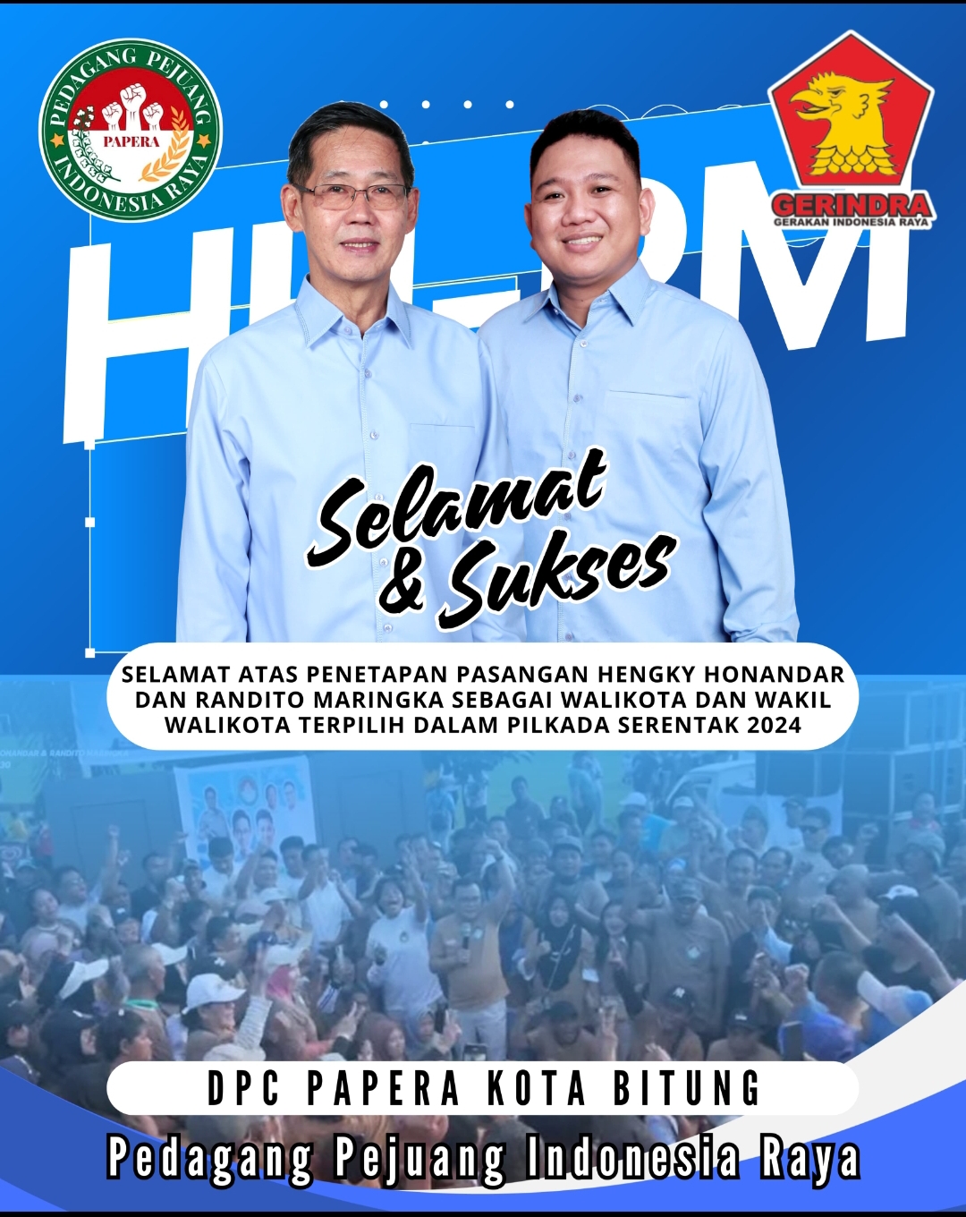 bitungnews.id || Bitung – Dewan Pimpinan Cabang (DPC) Pedagang Pejuang Indonesia Raya (PAPERA) Kota Bitung mengucapkan selamat atas ditetapkannya Hengky Honandar dan Randito Maringka sebagai calon terpilih, pada Pilkada Serentak Kota Bitung 27 November 2024.