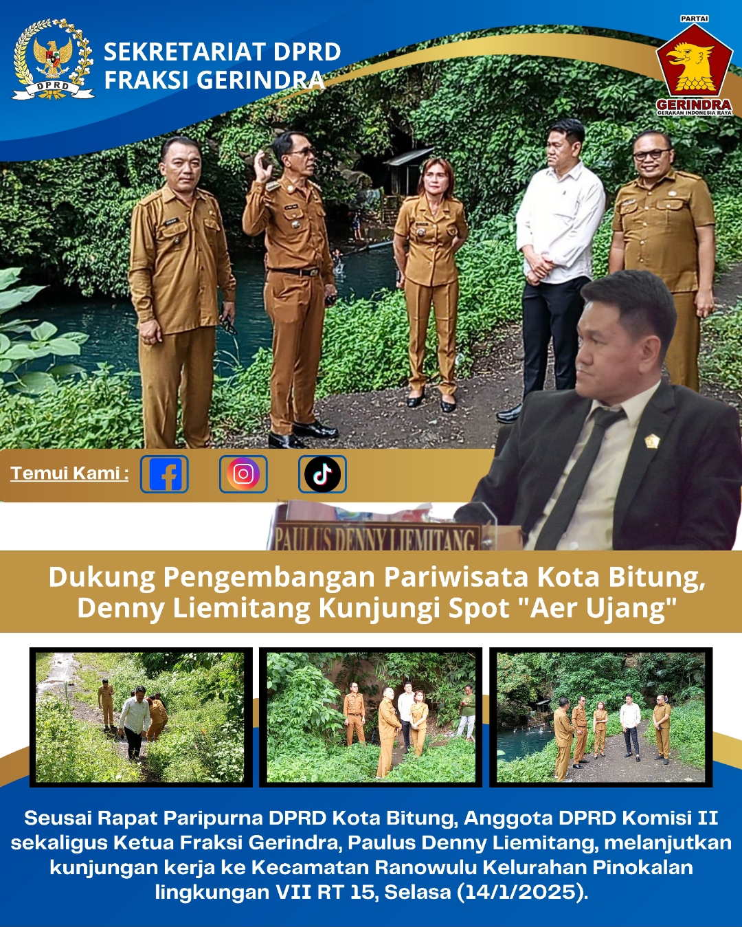 Kunjungan kerja tersebut dengan maksud untuk meninjau lokasi Aer Ujang yang terletak tepat di bawah jalan Tol di Kelurahan Pinokalan, yang rencananya akan dikembangkan menjadi salah satu destinasi Pariwisata Kota Bitung.