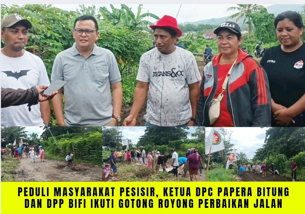 BITUNGNEWS.ID, BITUNG – Warga pesisir pantai Dodik Wangurer bersama Keluarga Besar Rukun Tasumaro menggelar aksi gotong royong perbaikan akses jalan menuju kampung Kodo Kelurahan Wangurer Kecamatan Girian, yang juga dihadiri oleh Ketua DPC Pedagang Pejuang Indonesia Raya (PAPERA) Kota Bitung, Vanny Kaunang, serta Ketua DPP Barisan Fisabillah (BIFI), Haji Rinto Pakaya, beserta Tim, Minggu (1/2/2025).