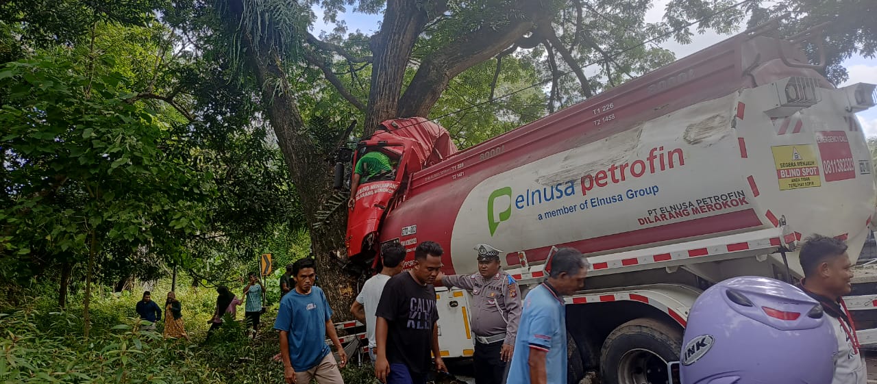 Gorontalo Utara (Bitungnews.id) – Kecelakaan tunggal menimpa mobil tangki milik PT Elnusa Petrofin di ruas jalan trans Desa Pontolo Atas, Kecamatan Kwandang, Kabupaten Gorontalo Utara, Kamis (13/2).