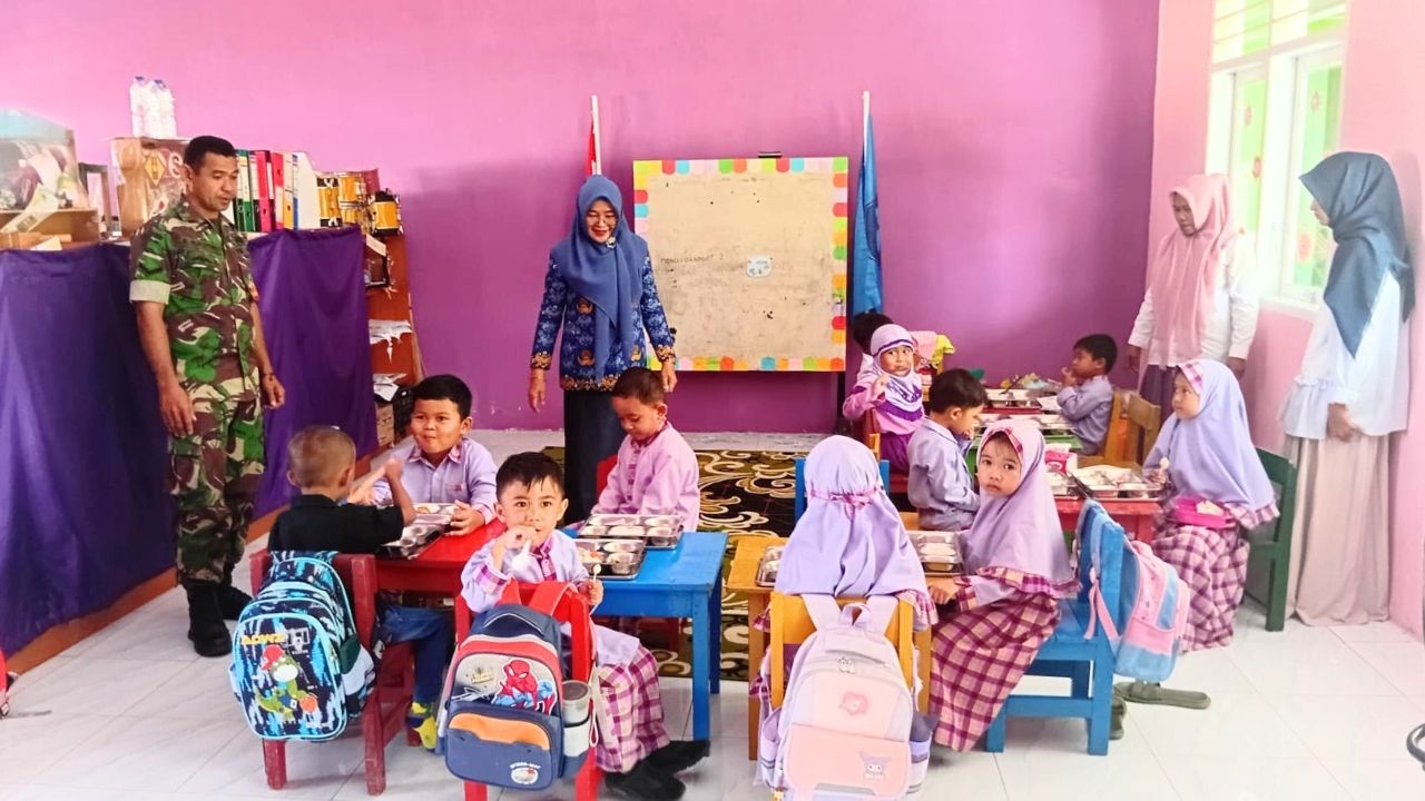 Di balik kelancaran kegiatan tersebut, hadir sosok Babinsa Koramil 1315-01/Telaga Biru, Serda Ruslianto Bukoting, yang sejak pagi mendampingi proses pendistribusian makanan. Mulai dari pengawalan dari dapur MBG hingga memastikan pembagian tepat sasaran di setiap sekolah. “Kami ingin anak-anak penerus bangsa mendapatkan gizi yang layak, aman, dan sehat. Inilah wujud nyata perhatian TNI untuk masa depan generasi Indonesia,” ungkapnya.