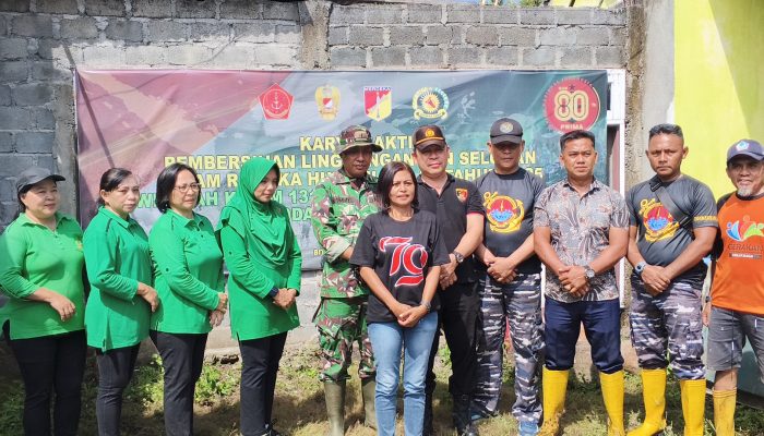 Bitung, bitungnews.id – Menyambut Hari Ulang Tahun (HUT) ke-80 Tentara Nasional Indonesia (TNI), Kodim 1310/Bitung Korem 131/Santiago Kodam XIII/Merdeka menggelar karya bakti pembersihan lingkungan dan selokan di Kampung Makassar, Kelurahan Pateten 1, Kecamatan Maesa, Kota Bitung, Jumat (3/10/2025).