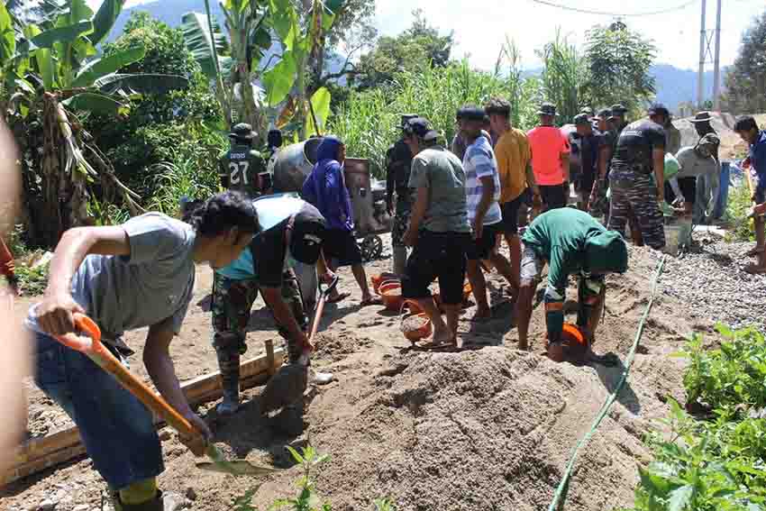 Suasana di lokasi kerja tampak penuh semangat. Sejak pagi, deru mesin molen bercampur suara cangkul dan tawa warga yang bekerja bersama. Tak ada perbedaan antara seragam loreng dan pakaian warga semua larut dalam semangat gotong royong untuk membangun desa tercinta.